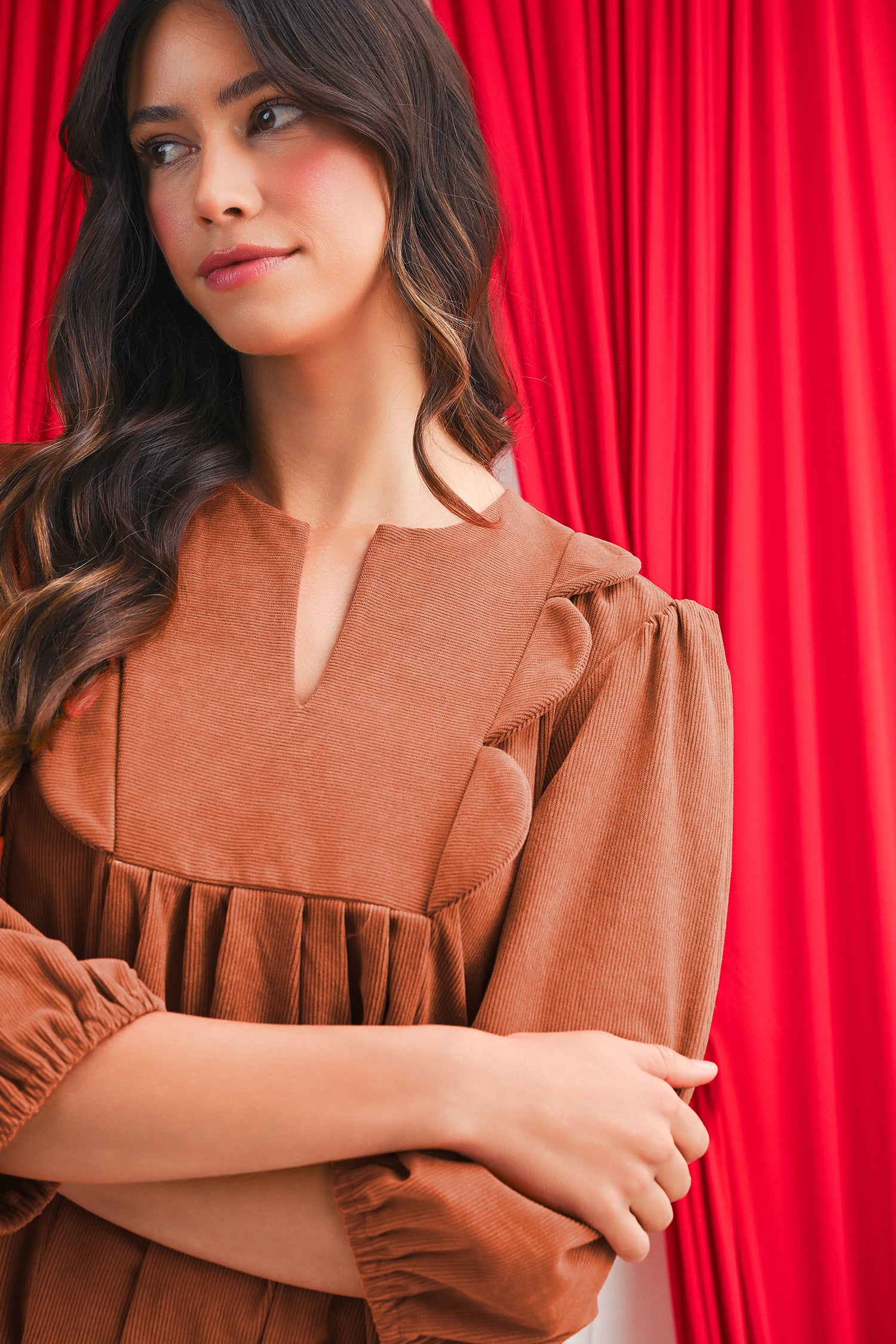 - The split neck detail adds a hint of allure, while the scallop edges on the neckline and sleeves provide a touch of whimsical femininity to the design.